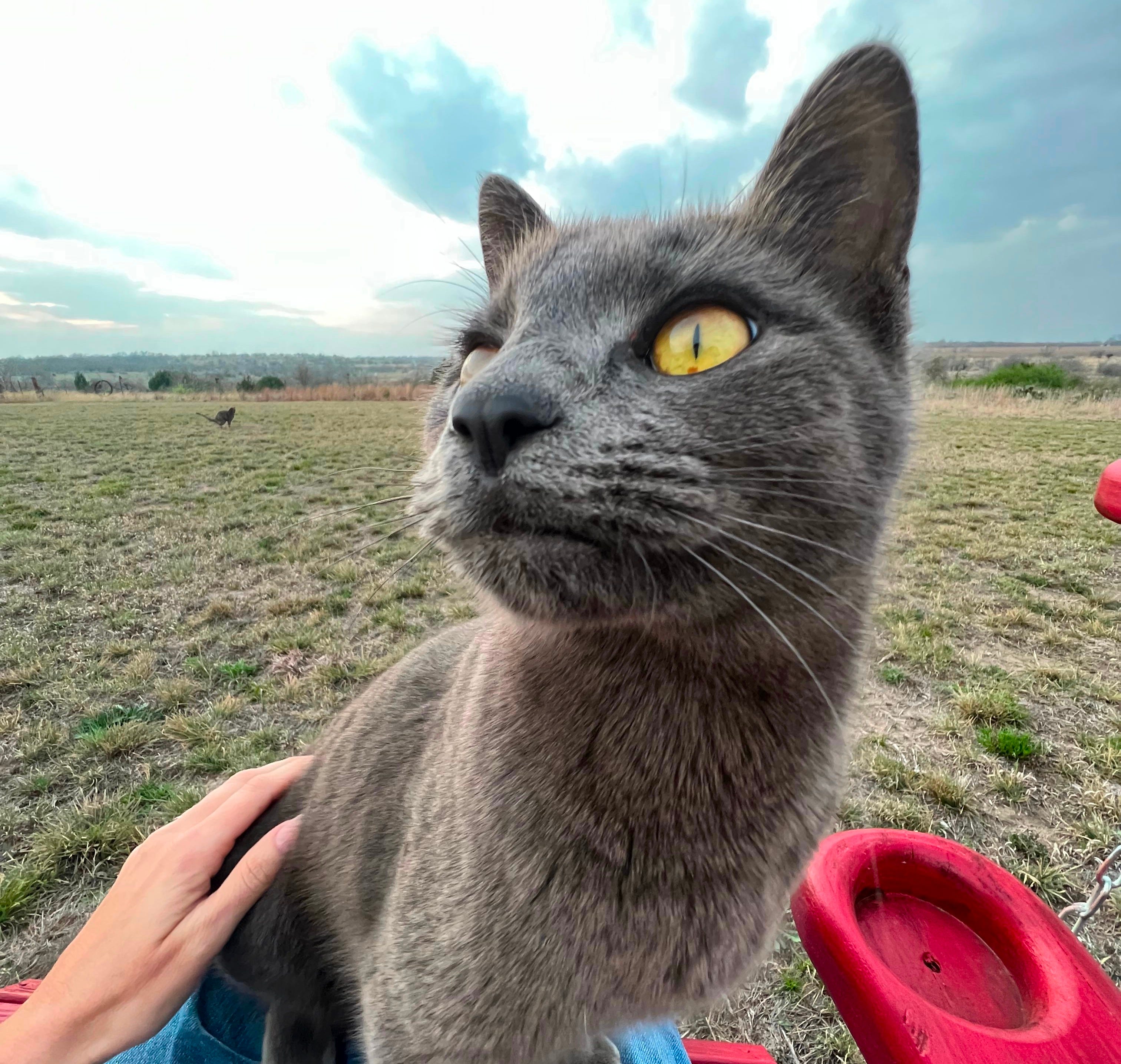 A soft mew began to waft from the woods beyond our fenceline. I continued calling the cats’ names. I finally spotted Pancha emerge in a nervous army crawl toward the back fence. Unbeknownst to us, the electric fence wire to deter the previous owner’s horses from leaning against it was hot. The girls likely shocked themselves on their nocturnal exploration, keeping them out rather than in.